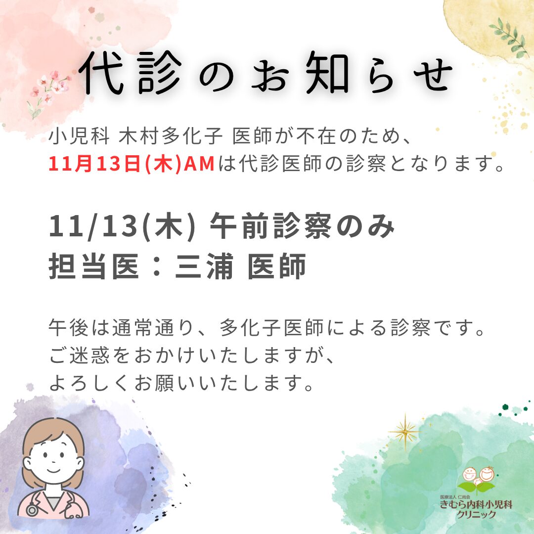 11月13日(木)の午前診察(9:00~12:00)は木村 多化子 医師が不在のため、代診とさせていただきます。