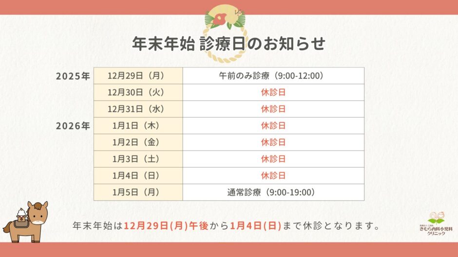 年内の診療は2025年12月29日(月)の午前(9:00~12:00)まで、年始は2026年1月5日(月)より通常診療を再開いたします。